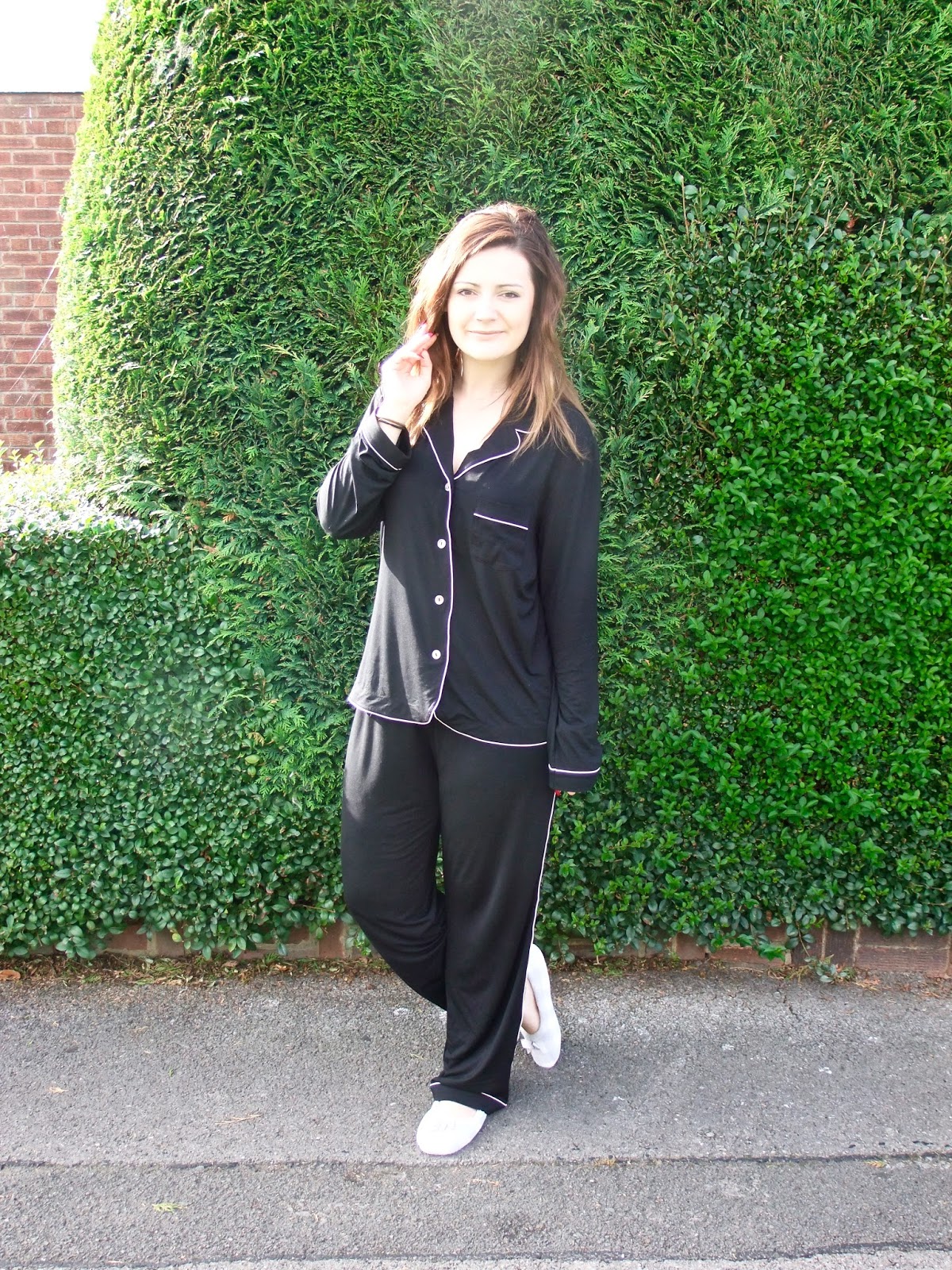This pyjama set is amazing. It's so soft and is really comfortable. I actually asked for a size bigger as i wanted it to be oversized but i probably could of got my normal size to be honest. The pjs are black and there is white piping as you can see. The trousers are quite long on me even though i've pulled them up and i'm 5ft6 so bare that in mind if you're thinking of buying them. I'm not going to lie to you, these pyjamas aren't exactly cheap. It's £60 for the set, which is quite pricey. You can definitely feel the difference between a pair of Primark pjs and these, the quality is a lot better and the material is a lot softer too. With these pjs i'm wearing a pair of these ballerina slipper things. They're grey & white checked with a little bow. They're so cute! I'm not wearing much makeup in these photos at all, just a bit of concealer, some mascara and a nude lip. This is also my hair taken out of a big top knot that it had been in for a couple of days. I did this because i thought it was silly to do an outfit post in pyjamas while wearing a full face of makeup, because obviously i wouldn't have that on when i went to bed. I thought keeping it natural was the way to go.